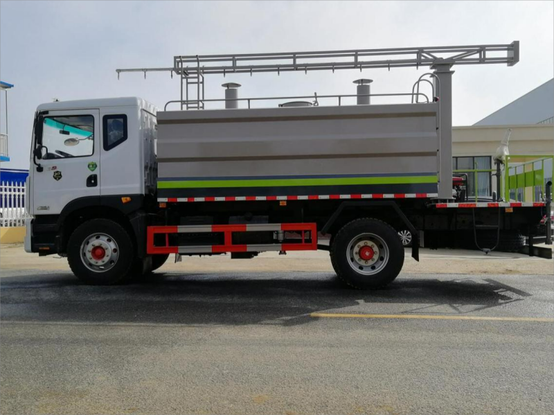 上裝配置:罐體采用瓦楞方箱制作,材質(zhì)Q235,邊4底5,容積:12-15方,標(biāo)配大功率50/110水泵,萬達(dá)液壓回轉(zhuǎn)機構(gòu),帶自動回流,整車氣動控制,駕駛室操作;罐體加熱功能,科普8千瓦發(fā)電機組;管道保溫帶電熱絲加熱;3個攝像頭(流量表,噴灑桿,整車尾部),駕駛室12寸彩色視頻可回放,遙控液壓控制裝置,駕駛室內(nèi)可觸屏操作。并配有液壓防沉淀攪拌裝置,箱頂2個1.5千瓦電機,葉片式絞龍機構(gòu);電子流量計,渦流噴射帶噴頭,氣動控制噴頭8個(一組控制4個噴頭),噴灑高度4.5米,勾檔停車可感應(yīng)3米,自動停噴,灑水車功能(前部沖洗路面噴灑裝置,兩側(cè)面噴灑裝置,帶后部工作平臺、平臺上安裝綠化灑水炮(炮噴射形狀可調(diào)),可調(diào)直沖狀、大雨、中雨、毛毛雨,可連續(xù)調(diào)節(jié),射程可達(dá)28米,垂直吸程≤7米),帶消防接口、自流閥,可自吸自排。